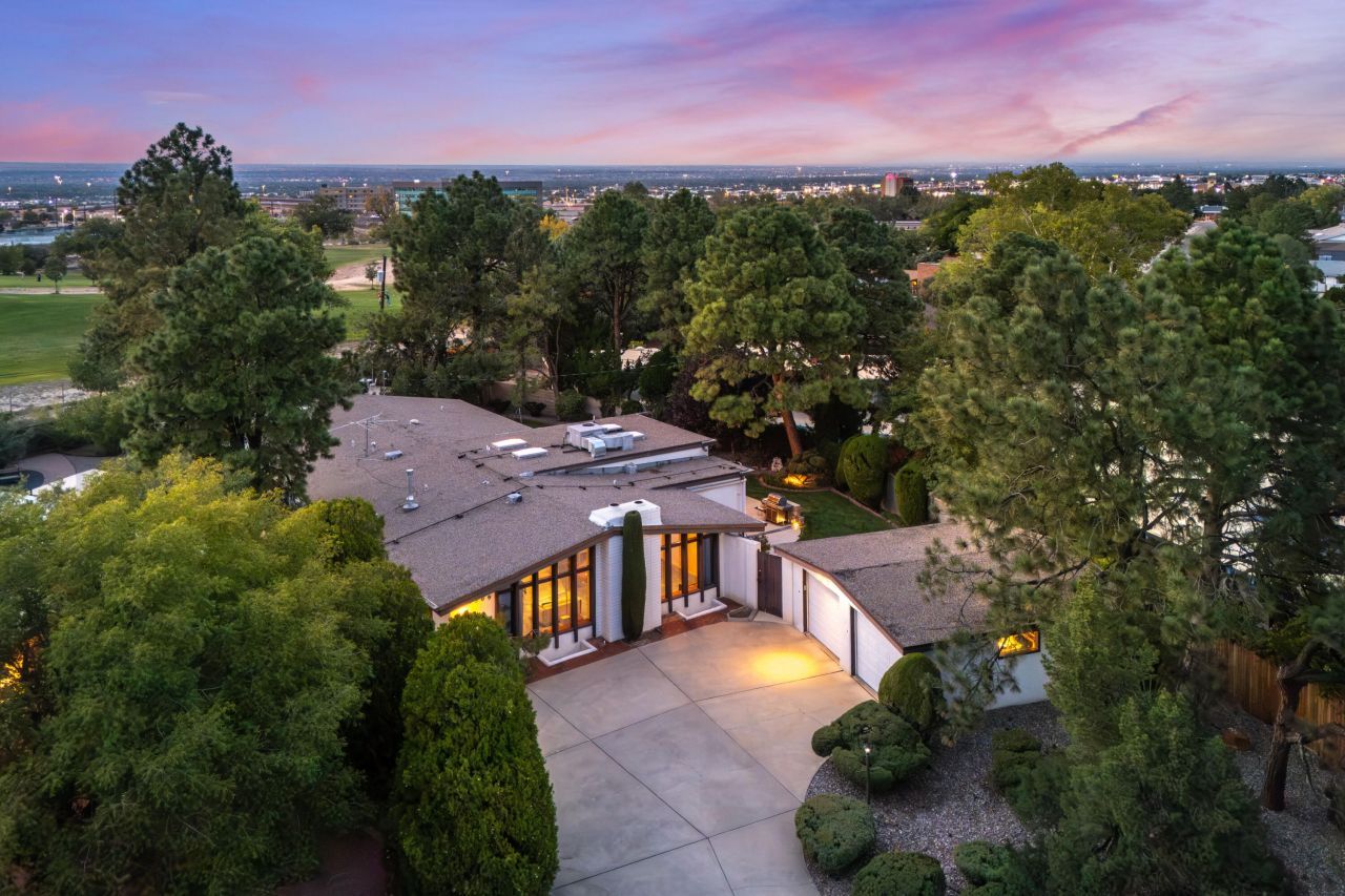 Registered on the Mid-Century Modern registry for Albuquerque this house is tucked away on a private cul-de-sac lot in the north UNM Vista Larga Addition up against the north UNM golf course with expansive sunset views. With a single story footprint, the floor plan also has a finished basement with a fireplace, a bedroom, 3/4 bath and living area. The formal living room and dining room have a high peaked ceiling with large picture windows alongside the centered fireplace. And the kitchen? Remodeled and added in 2008, all of the cabinetry is custom complete with solid surface counters, stainless appliance package, full view windows to the backyard, chef's cooking island and built in desk area, breakfast nook and doors onto the patio with electric awning for outdoor