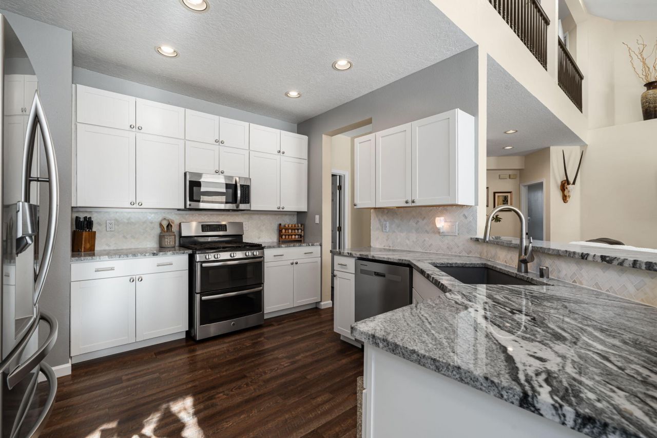 Heated Saltwater POOL, thoughtful updates, & ready for its next chapter! Sitting on a 1/4 acre corner lot located in a quiet cul de sac, this home features a light and bright kitchen w/ granite countertops, farmhouse sink, new cabinetry & LVT flooring, opening to inviting living space, anchored by a cozy fireplace w/ stacked stone. Downstairs owner suite offers backyard access, dual sinks & walk-in closet, plus additional living area & bedroom on main level. Upstairs includes two bedrooms & finished loft. Major updates include furnace 2025, water heater 2 yrs, stucco repainted 2024, pool heater & AC 2018, new slider doors, updated fixtures & newer carpet. Located in the coveted Volcano Vista district w/ easy access to Paseo, grocery & dining.