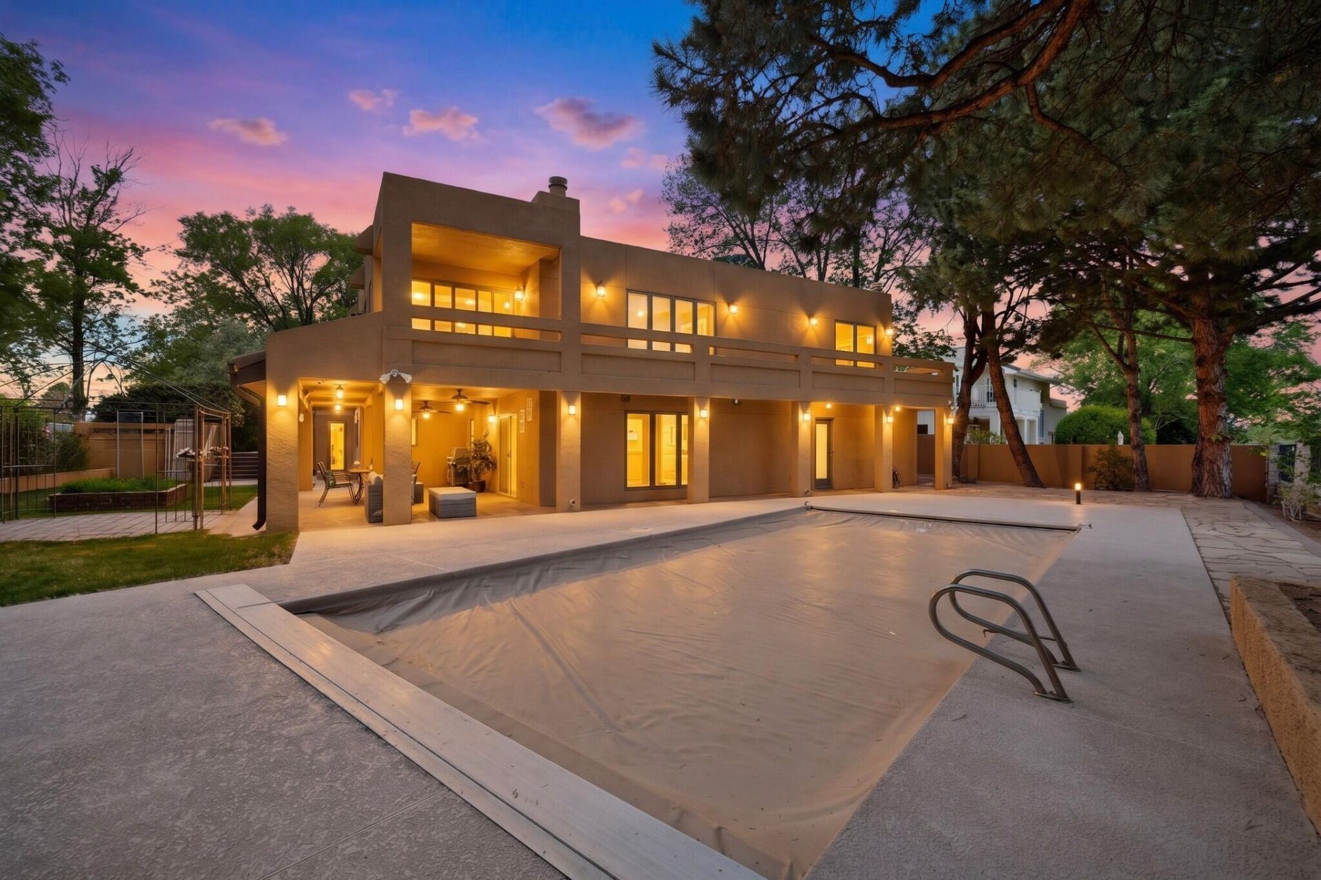 Nestled in the harmonious and gated Tanoan West Community, this .34 acre corner lot property is adjacent to the golf course fair-way by Zia number 6 hole. Amenities include triple master suites, in-law suite w/ separate entrance ,entertainment room, two comfortable living areas, dining room, breakfast nook, wet bar, water softner, sizable kitchen, solid oak custom front door, recessed lighting, ample storage space, an entertainers dream backyard with an extended deck, covered patio, built in-ground swimming pool w/ auto-cover,pump,heater,filter installed in 2025. Two newer tankless water heaters and three HVAC combo units.All in-placed furniture including gym equipment conveys.Seller's personal items,computers,electronic equipment do not convey. This maybe the best value in Tanoan